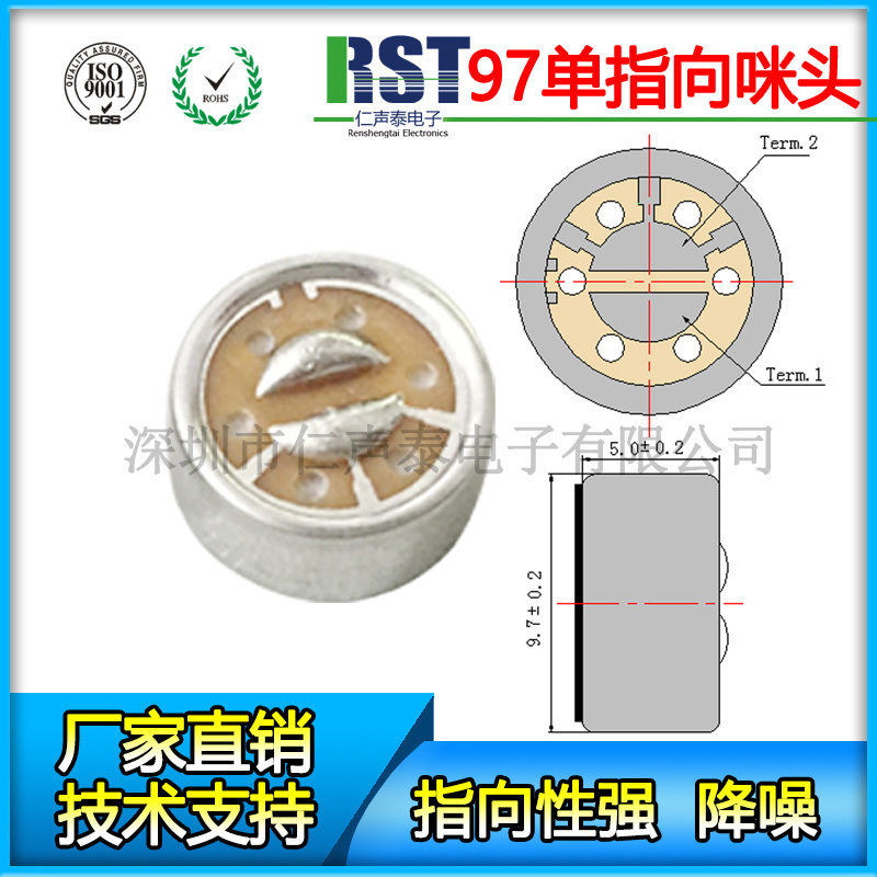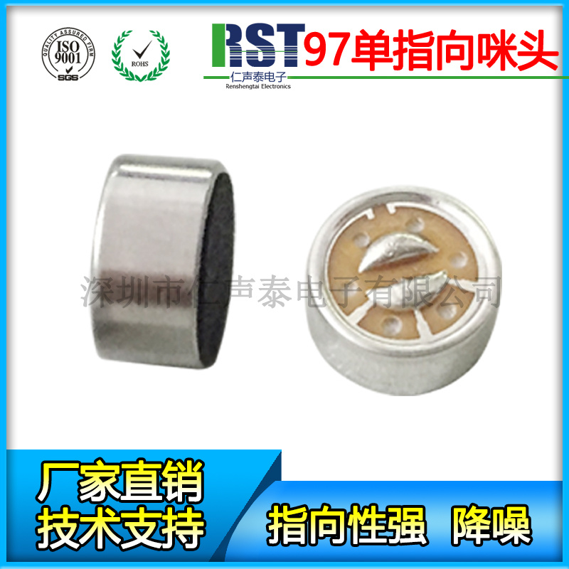★產(chǎn)品尺寸:Φ9.7*5.0mm? ★產(chǎn)品描述:F9750UL?F9752UL ? 背極式?振膜式駐極體單指向咪頭 ★產(chǎn)品性能:產(chǎn)品抗嘯叫能力強(qiáng)。拾音效果強(qiáng),音質(zhì)好,指向性明顯,保真度高。靈敏度范圍可以做到-43dB到-58dB,選擇范圍大。質(zhì)優(yōu)價(jià)廉!可根據(jù)客戶要求調(diào)整咪頭頻率響應(yīng),可控制聲音清脆、通透、低沉。 ★應(yīng)用領(lǐng)域:主要用于掌上KTV、K歌寶、藍(lán)牙K歌麥克風(fēng)、頭戴式麥克風(fēng),領(lǐng)夾麥克風(fēng),對(duì)講機(jī),胸麥,喊話器,超市擴(kuò)音器等聲音放大設(shè)備。 靈敏度范圍可以根據(jù)不同需求加工定做,選擇范圍大。