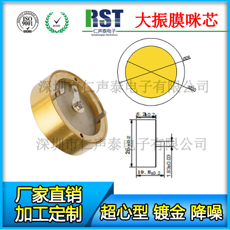 咪頭名稱 26mm 單指向鍍金大振膜鍍金咪頭 咪頭指向性 單指向 咪頭規(guī)格 φ26.0*H8.2mm 咪頭類型 駐極體電容咪頭傳聲器 靈敏度 可根據(jù)客戶要求定制 輸出阻抗 680Ω