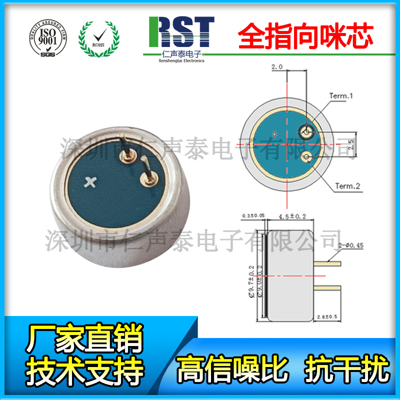★產(chǎn)品尺寸:Φ9.7*4.5mm? ★性能特點:駐極體全指向咪頭??抗干擾 高靈敏度低噪音咪芯? ★產(chǎn)品描述:進口芯片,遠距離拾音效果,音質(zhì)好,不嘯叫,? ?高保真。 ★應(yīng)用領(lǐng)域:要用于領(lǐng)夾麥克風、錄音筆、智能教學話筒、平板電腦、對講機、無線麥、戶外降噪耳機、移動設(shè)備、無線錄音設(shè)備、行車記錄儀、頭戴麥、頭戴麥、迷你麥克風、車載藍牙、車載免提等設(shè)備。